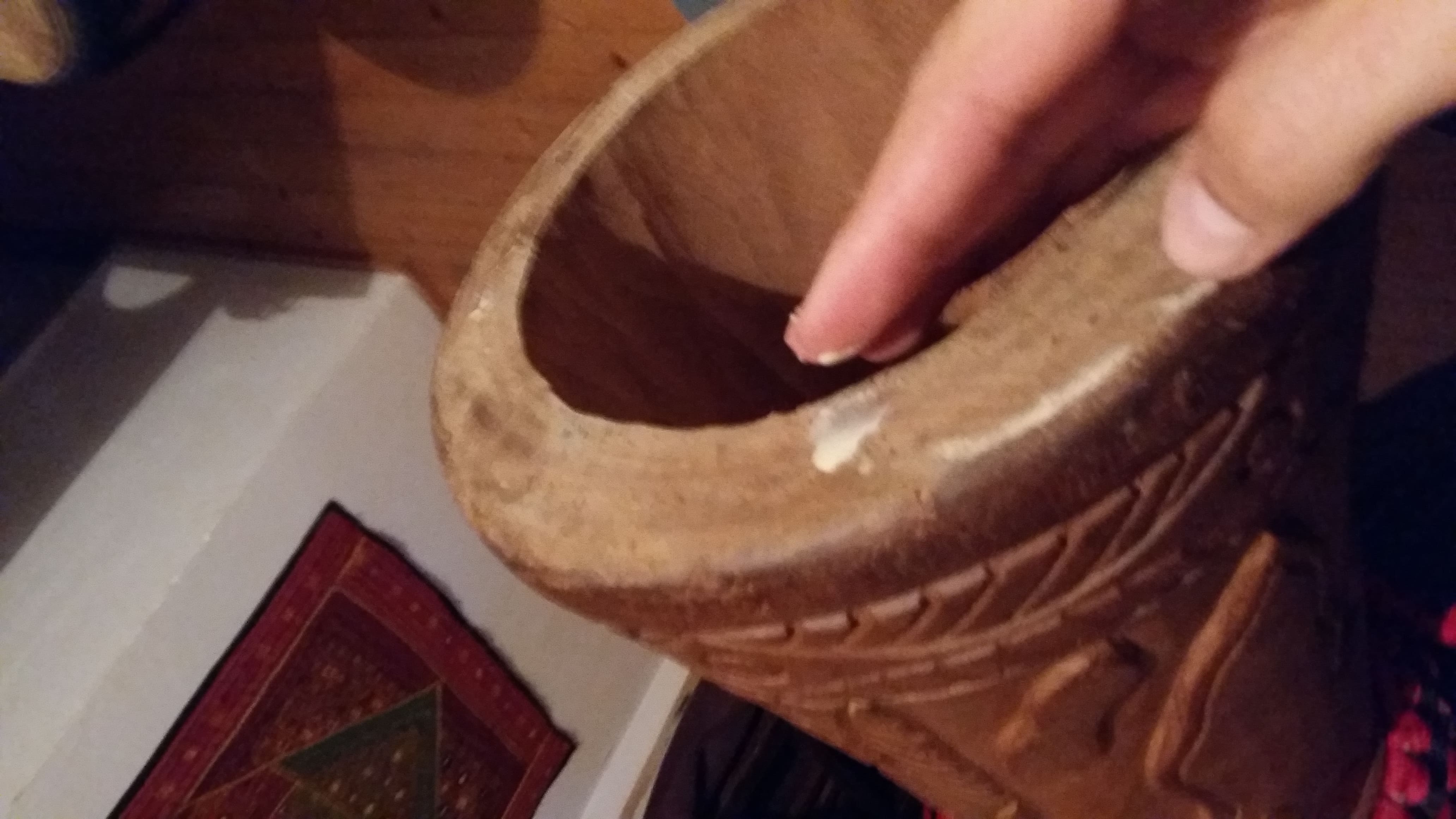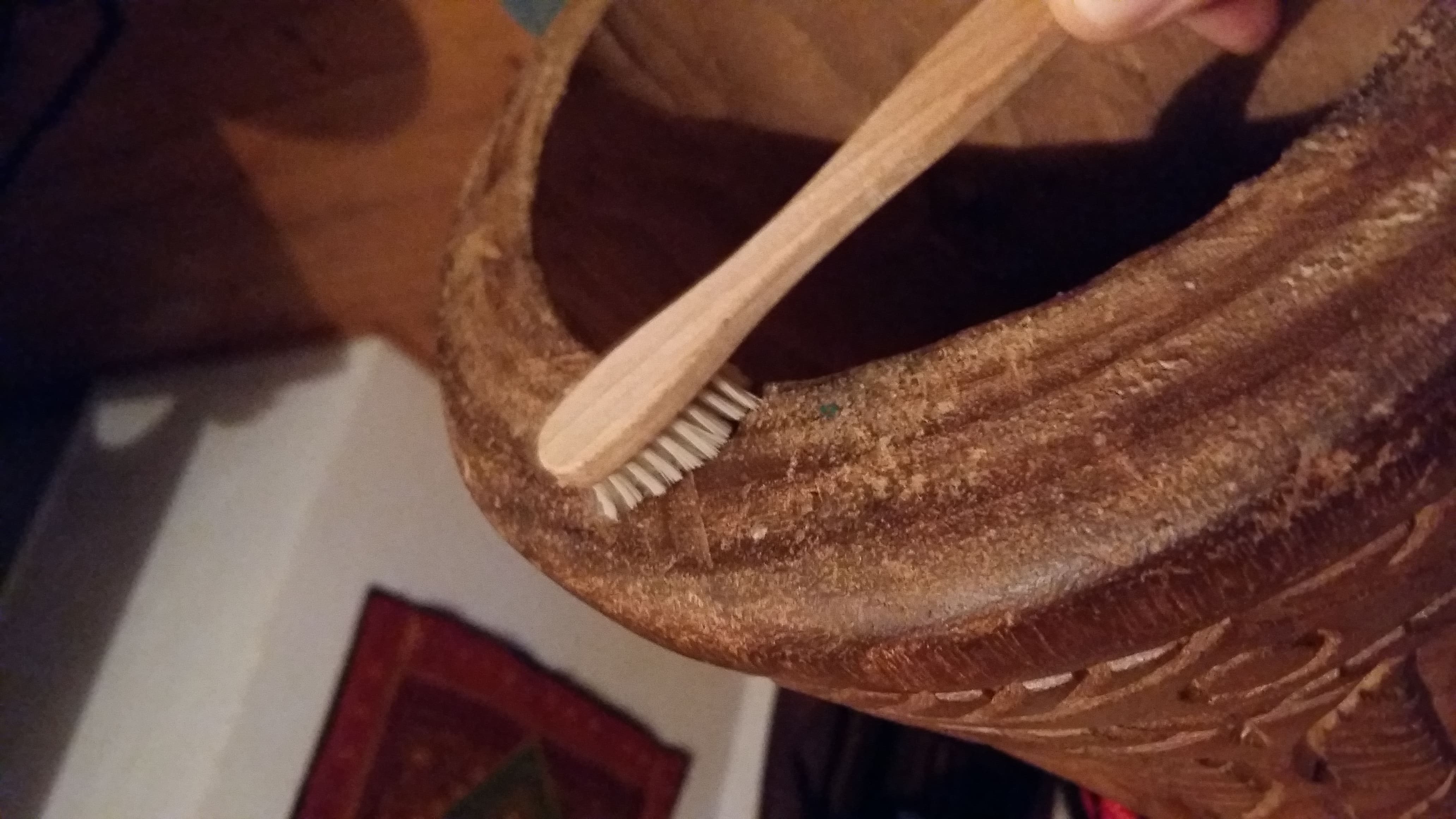 Wichtig ist die Unterkante der Djembe, da sie darauf steht. Dieser Ring ist dem Boden, also Unebenheiten & Feuchtigkeit, ausgesetzt. Ich bearbeite die Trommel zunächst, indem ich etwas Sheabutter mit dem Finger auf der Unterkante verteile. Danach arbeite ich die Sheabutter mit der Zahnbürste in die Unebenheiten ein. Die ersten 15cm der Innenseite bearbeite ich ebenfalls mit der Zahnbürste.